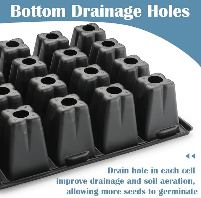 - 【Both Pots and Trays】This special tray hole each size is same as normal 2.5" square pots, 3.5" deep, which is perfect size for seeds germination for a longer time. It has very big holes(0.9") at the bottom is very easy for transplant the baby plants after it's germination by whole. The Trays deepth is higher than trays which is good for bottom watering from the side of the trays.