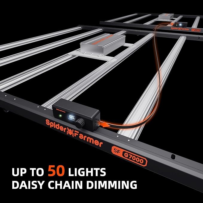 - 【DIMMABLE WITH DIGITAL DISPLAY】Easily adjust the brightness for every stage of plant growth with the dimmable G7000 Spider Farmer grow light. The built-in digital display shows the current brightness level, and the lights can be daisy-chained, controlling up to 50 units from one master light—ideal for increasing efficiency in commercial setups