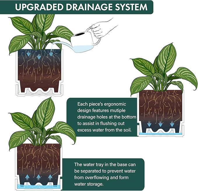 - Bottom Watering Catch Tray Design: Features a deep saucer and pot with a drainage holes, allowing excess water to drain and preventing overwatering. Keeps plants thoroughly hydrated for healthy growth via bottom watering.