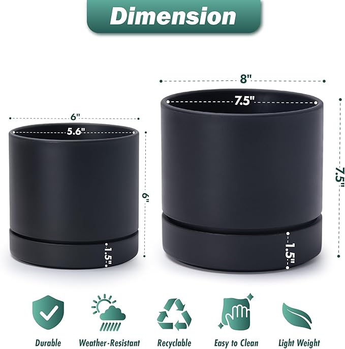 - Two Size Set: Includes a 6-inch pot (6" diameter, 6" height) and a 8-inch pot (8" diameter, 7.5" height). Ideal for a variety of small to medium plants. Please refer to the dimension image for exact measurements.