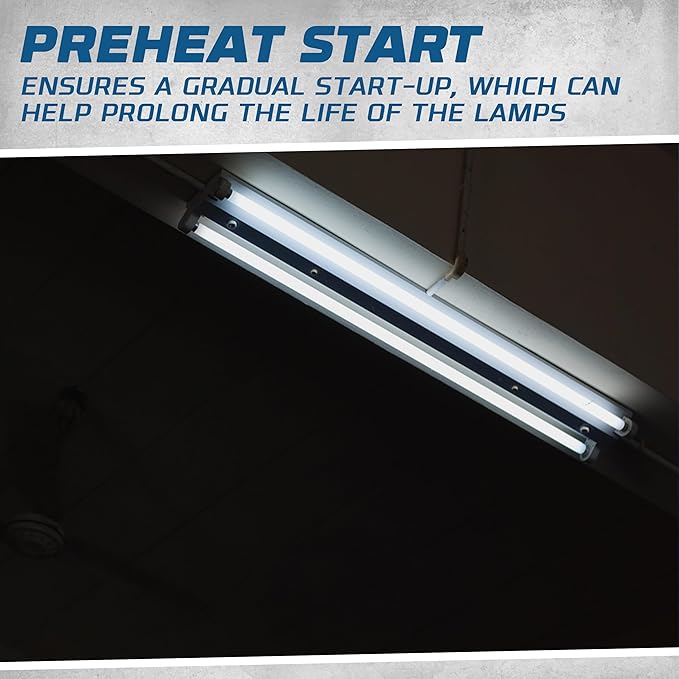 - Preheat Start Technology: Features preheat start method for smoother lamp ignition, minimizing flicker and extending the lifespan of both the ballast and the connected lamps.