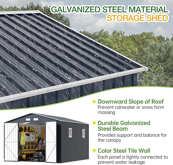 - Durable Construction: Crafted from galvanized steel, this shed is rust-resistant and weatherproof, ensuring long-lasting durability even in tough outdoor conditions.
