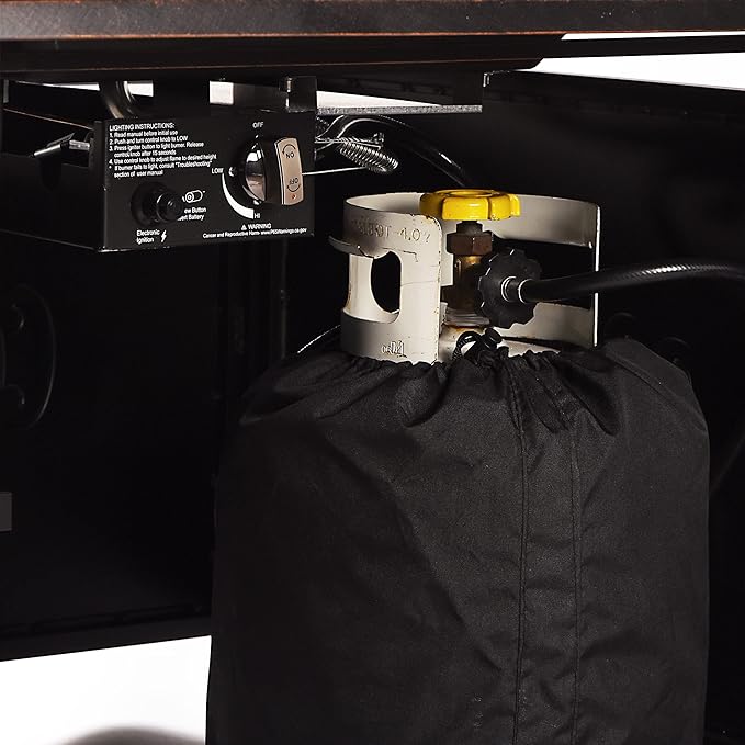 - This set comes with two loveseats, two swivel rocking chairs, quick drain cushions, glass wind blocker, clear fire glass, a table lid, propane cover and a protective fabric table cover
