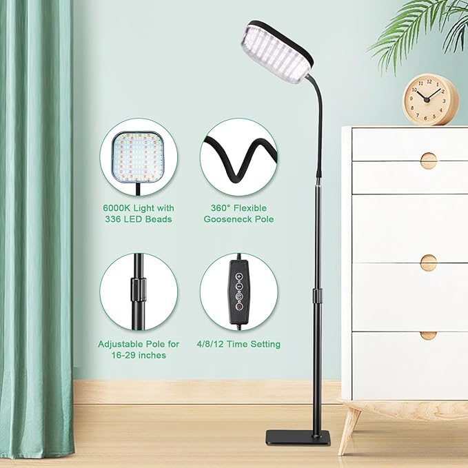 - Higher Efficiency and Upgraded Style: The 6000k Full Spectrum floor lamp equiped with 336 LEDs can provide higher levels of illumination for plant growth. The grow lights applying updated technology have 50,000 hours long lifetime, good for indoor growing.