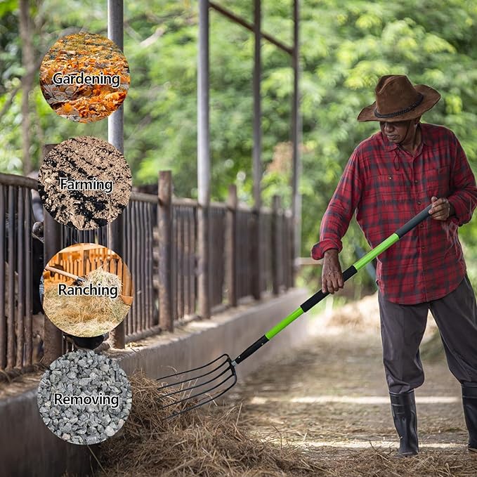 Pitch Fork-57 Inch,5-Tine Steel Garden Fork Heavy Duty, Mulch with Cushion Grip, Green Fiberglass Handle
