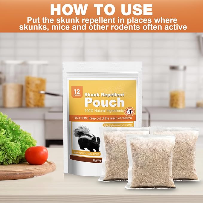 - Friendly Active Ingredients: The skunk repellent pouches is made of natural plant ingredients and no harmful for people, pets and plants, follow the manual each pouch keep 9 ft distance
