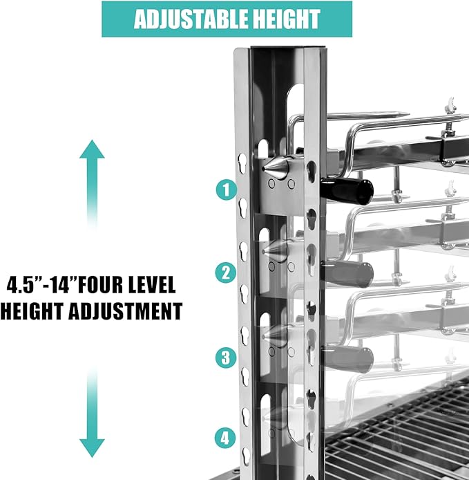 - 【Simple BBQ Rotisserie Grill】The 25W upgraded electric motor is powerful enough to roast the whole lamb automatically. It has four-level height adjustments to control temperature. Multi-vents on the both sides can help charcoal burn well and the ash catch pan can collect and dispose the ashes. You can roast the whole sheep on the upper layer and self-help barbecue in the net cooking area below. Make the barbecue quicker and easier.