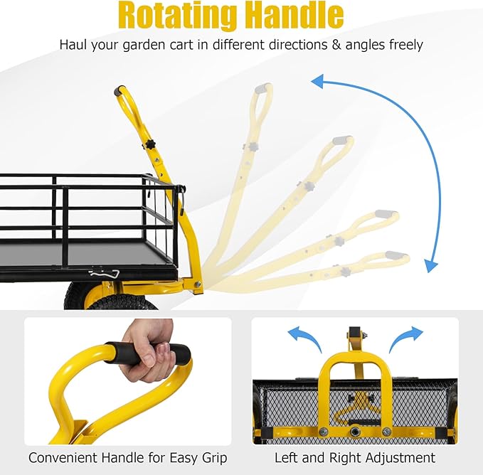 - 【 Portable Design & Easy to Maneuver 】 Thanks to the rotating handle, it enables you to haul your garden cart in different directions & angles freely. With options for left and right adjustment, this convenient handle offers a comfortable grip, enhancing flexibility and control over your hauling tasks on any terrain.