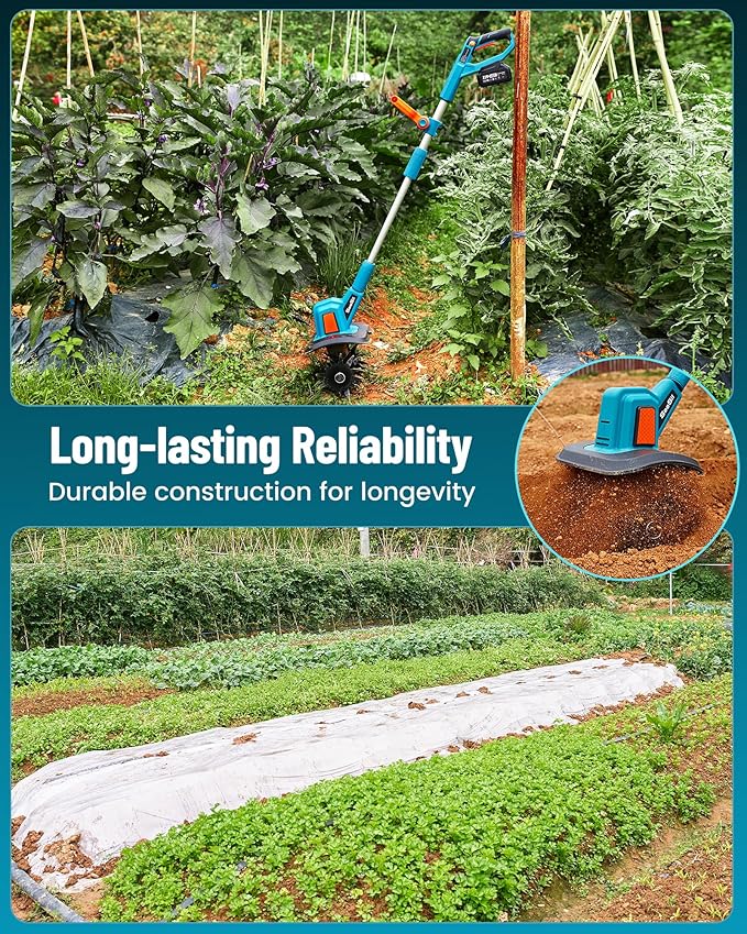 - Battery Powered Garden Tiller: Dual Battery Advantage - The inclusion of two 4.0Ah batteries doubles your tilling runtime, providing extended operation on a single charge. Whether you're cultivating hard, compacted soil or working through softer terrain, you'll experience seamless power delivery from start to finish