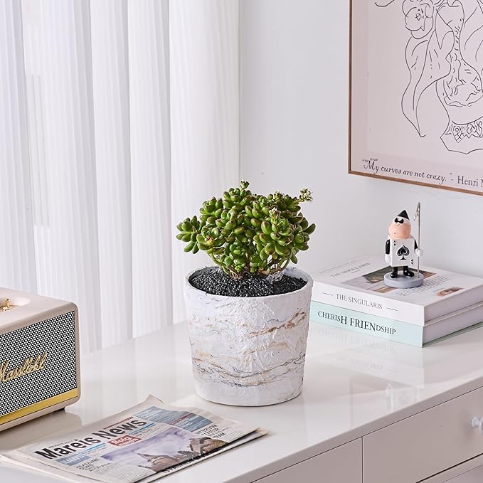 Ekirlin 7 Inch Natural Ore Textures Plant Pot, Resin Outdoor Planters with Drainage Hole, Removable Rubber Stopper and Non-Slip Soft Pad,Weatherproof Decorative Pot for Indoor/Garden Plants