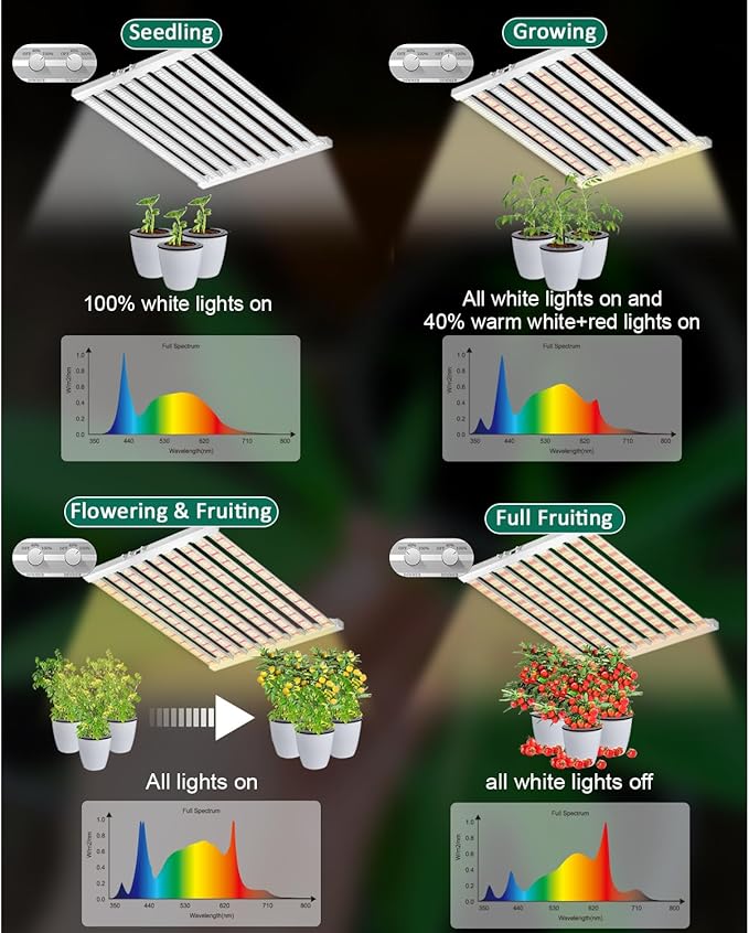 - 【2023 Upgraded Dimmer Modes】- This upgraded light has 4 dimmer modes for different growing stage, plants will get absolutely full spectrum nutrition. If you turn to 40% for the first dimmer switch, 5 white light bars will on; If you turn to 100%, all white LEDs will on, it’s best for seedling and growing. If you turn to 40% for the 2nd dimmer switch, 4 light bars will on with warm white, red and IR LEDs; If you turn to 100%, all light bars will on, it’s most suitable for blooming and fruiting.