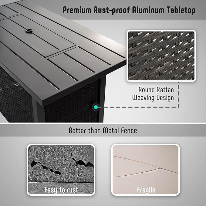 - Artisan Design: The fire table features a beautiful aluminum tabletop and wicker design, which can be paired with various courtyard furniture. This firepit table for patio is equipped with crystal blue fire glass, adding extra romantic colors to the fire pit