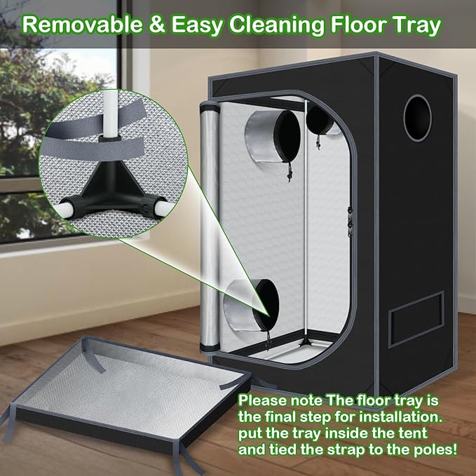 - Upgrade Design --- UPGRADED CONNECTOR--Durable PA Material Adopted, Anti-rust Reinforced Design, Adjustable Tightness According to The Pole, Hold Poles Tightly for Firmed Support. Multiple vents to accommodate fans and filter; ducting rectangle window with mesh to keep dust and insects out; Removable mylar floor tray easy to clean.