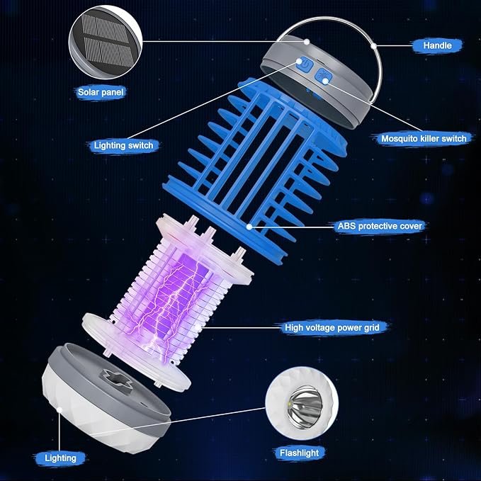 - 3-in-1 solar bug zappers outdoor: the mosquito killer outdoor uses the physical mosquito killing principle, utilizes the mosquito love light characteristics, simulates the human body temperature feeling, emits 360-400 nm ultraviolet light in an all-round way, instantly attracts and kills mosquitoes and other insects. The combination of camping lights, mosquito killers and flashlights, which flashlight has 3 different modes: low/high/flashing light mode.