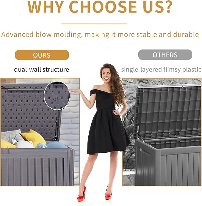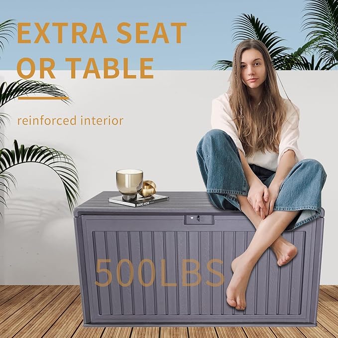 - Sturdy Pool Deck Box: Crafted with a rugged all-weather resin frame and reinforced internal support, this large deck boxes outdoor waterproof is built to last. It's resilient to high temperatures and UV rays, providing lasting durability.