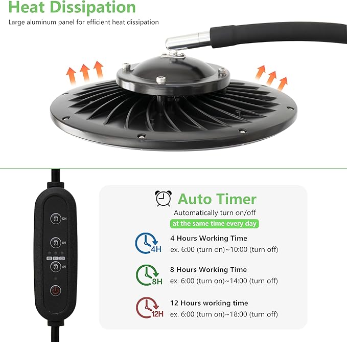 - 4/8/12H Auto Timer: The grow light comes with a 4/8/12H cycle timer system. This means you only need to set the timing once and the plant light will automatically cycle on and off time on time every day. You don't have to worry about the illumination situation when you go out at all. (Tip: If you disconnect the power, you need to set the timer once again)