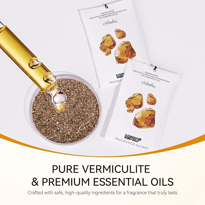 - MYARO Amber Sachet Bags: Includes 12 scented sachets (each bag size: 4.13 inch x 2.76 inch). Our natural fragrance will take you on a journey with the amber fresh scents sachet packets