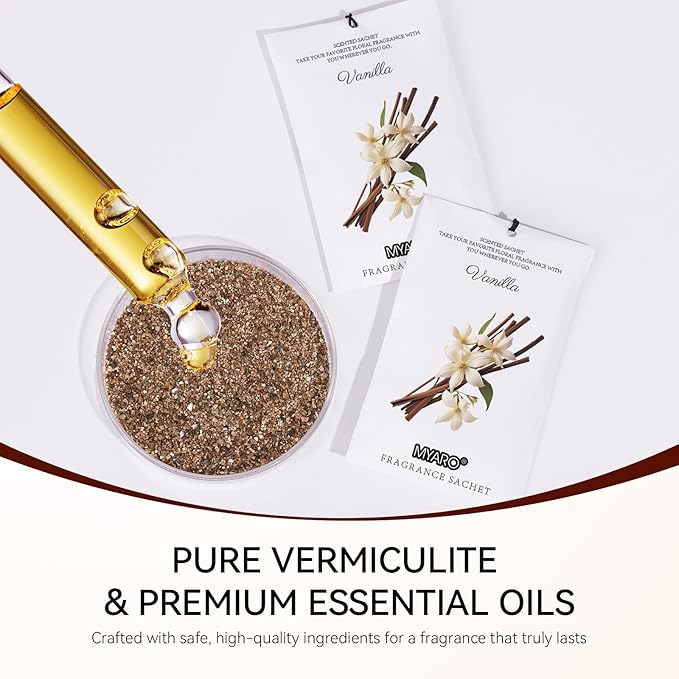 - MYARO Vanilla Sachet Bags: Includes 12 scented sachets (each bag size: 4.13 inch x 2.76 inch). Our natural fragrance will take you on a journey with the fresh scents sachet packets