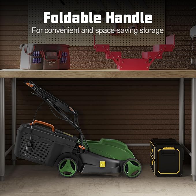 - 【 Space-Saving & Foldable Design 】 The corded electric lawn mower comes with a foldable handle, allowing for convenient storage and transportation. Simply fold the handle after use for compact storage in your garage or shed, keeping your lawn mower protected.