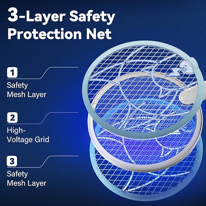 - ⚡ Safe & Easy to Use - Featuring a 3-layer protective mesh, this handheld bug zapper prevents electric shock from accidental contact, making it safer for family use. Simply press the button to activate the electric fly swatter and start zapping!