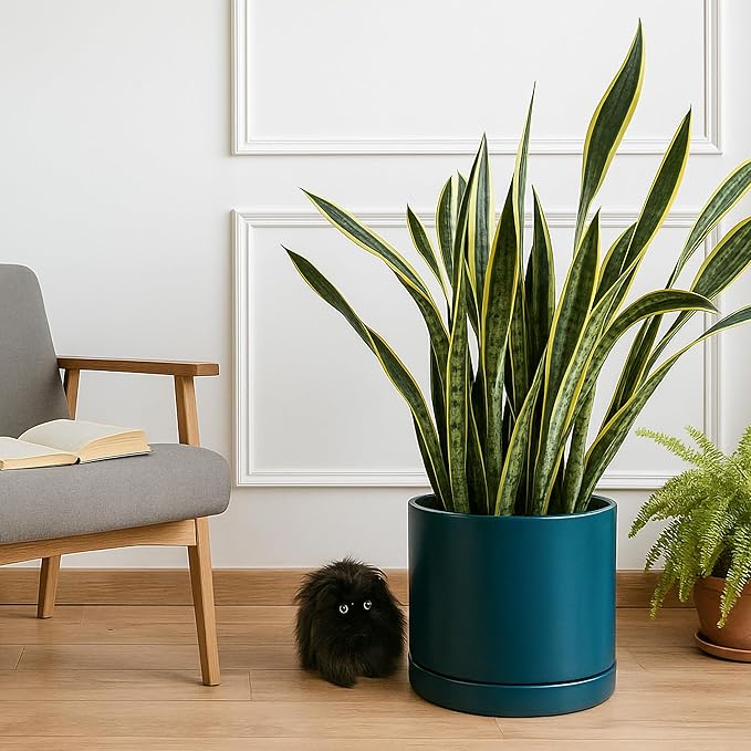 D'vine Dev 14 Inch Ceramic Planter Pot with Drainage Hole and Saucer, Indoor Cylinder Round Planter Pot, Teal, 94-O-G-9