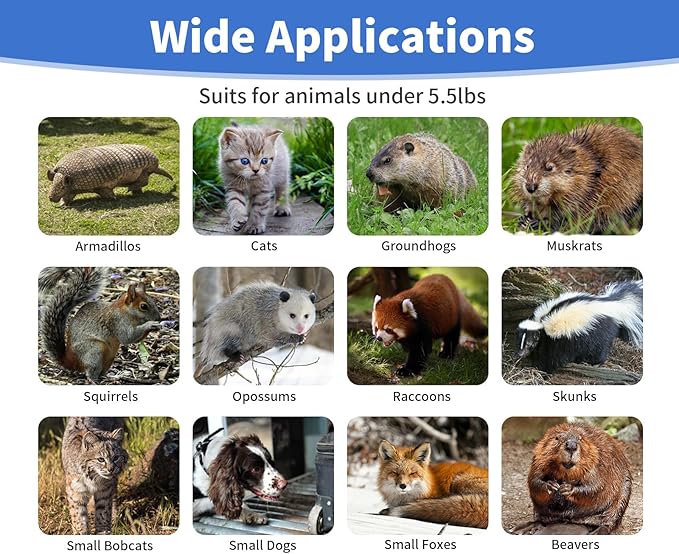- Wide Application: Measures 24 * 7 * 8 inches. Suitable for squirrels up to 5.5 pounds, small stray cats, small raccoons, skunks, moles, otters, armadillos, rabbits and other small animals