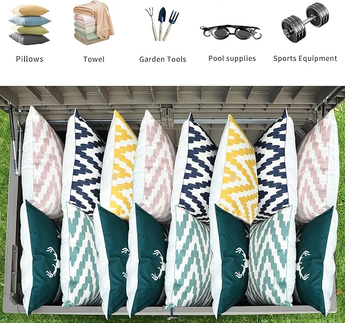 - Versatile Use: Our large 230 gallon deck box seamlessly blends into any yard or patio, providing storage for furniture cushions, gardening tools, sports gear, and pool accessories; The top layer can be used as a table or stool with its appealing wood-like texture