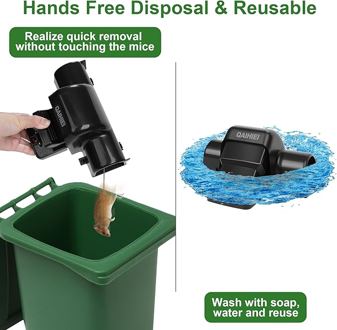 - Reusable and Easy to Clean: Durable and cleanable, the mouse trap allows you to simply press the trigger to dispose of the mouse without touching it. It is recommended to check the rat trap regularly, clean, and reset the trap to ensure ongoing efficiency and quickly get rid of rodent