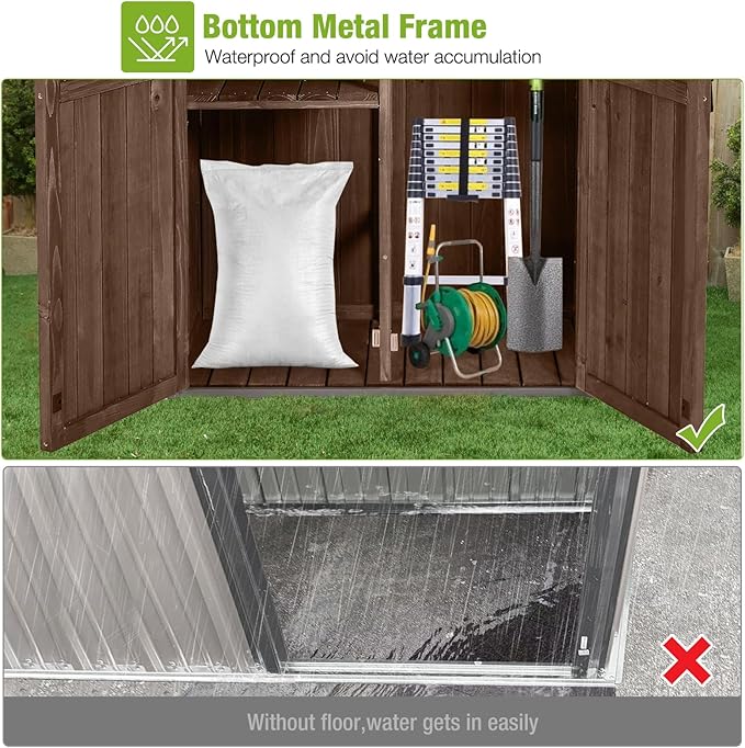 GUTINNEEN Outdoor Storage Shed with All Around Strong Metal Frame, Garden Tool Sheds Cabinet with Floor & Adjustable Shelves, Wooden Tool House for Backyard Garden Patio Lawn (Dark Brown)