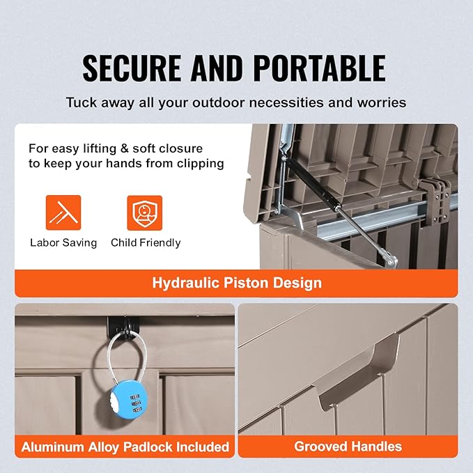 - Added Security and Portability: Our patio storage box locks in place to keep your special items safe. Plus, an extra padlock is included. And guess what? Our deck storage box comes with a built-in hydraulic lift system to ensure that it's always safe to open and close! Say goodbye to smashed fingers. Besides, each side is designed with a built-in handle that makes it easy to move the box.