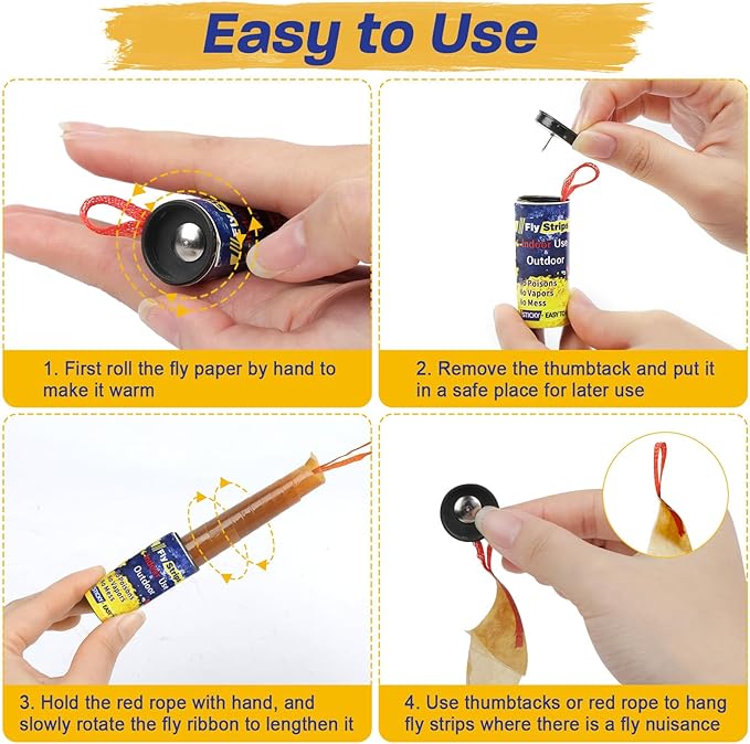 - Convenient to use: the sticky indoor fly traps are designed for effortless application. Just pull the string to release the tube and hang the fly tape in locations like homes, ranches, garages, storage sheds, and areas where animals are kept. When the fly strips are full, simply take them down and throw away the paper tape