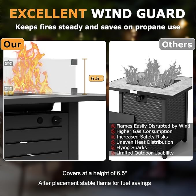 - GLASS WIND GUARD FOR EXTRA PROTECTION: Enjoy uninterrupted flames in any weather! The included glass wind guard shields the fire from gusty winds, keeping the flames steady and vibrant even on breezy evenings. It’s the perfect addition for a safer, more enjoyable outdoor experience.