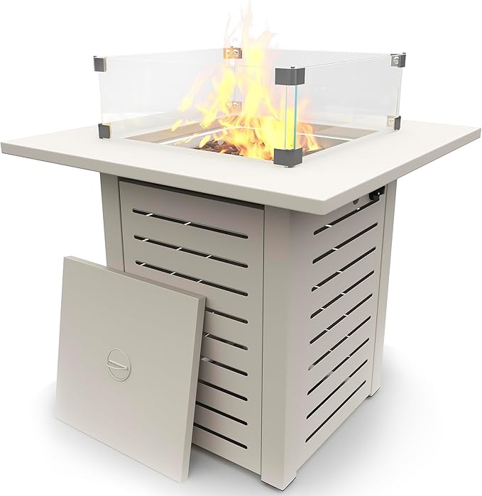 MBY 28'' Propane Fire Pit Table, 50,000 BTU Steel Gas Firepit for Outdoor Patio Deck and Garden, CSA Certified Fire Pit with Lid, Waterproof Cover, Glass Wind Guard and Lava Rock, Beige
