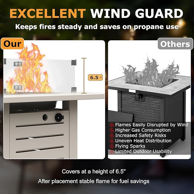 - GLASS WIND GUARD FOR EXTRA PROTECTION: Enjoy uninterrupted flames in any weather! The included glass wind guard shields the fire from gusty winds, keeping the flames steady and vibrant even on breezy evenings. It’s the perfect addition for a safer, more enjoyable outdoor experience.