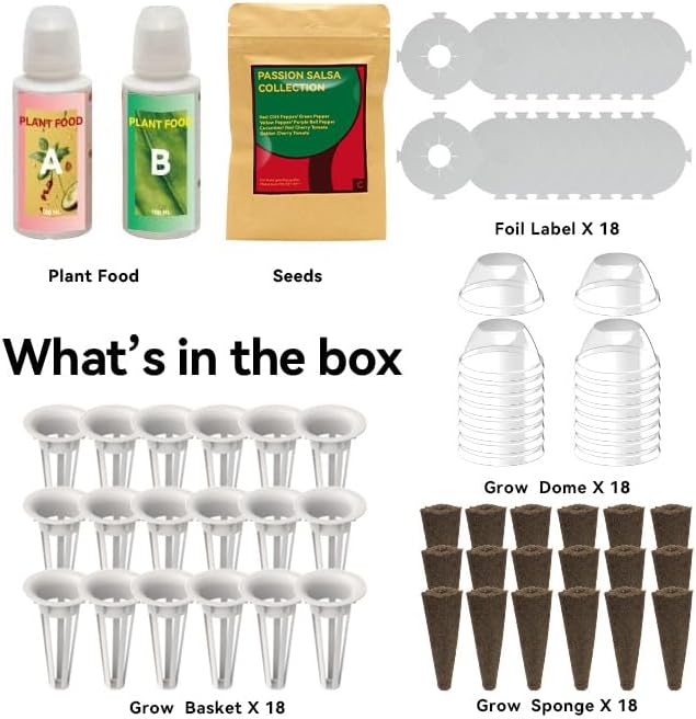 - Complete Seed Pod Kit: This hydroponic pod kit includes 12 sets of foil labels, grow domes, grow baskets, grow sponges, seeds, and A&B plant food. Everything you'll need to start indoor home garden