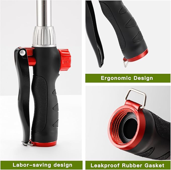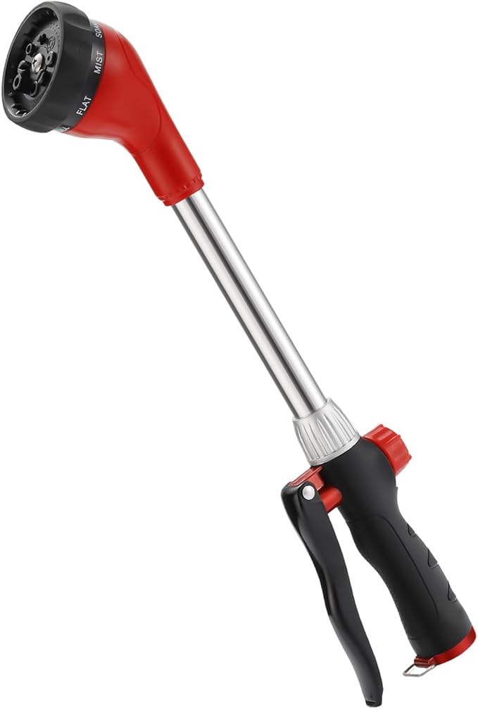 GREEN MOUNT Watering Wand, Heavy Duty Garden Hose Wand with 8 Spray Patterns, 16-Inch Hose Sprayer Nozzle with Flow Control, Ideal for Lawn and Garden Use, Red