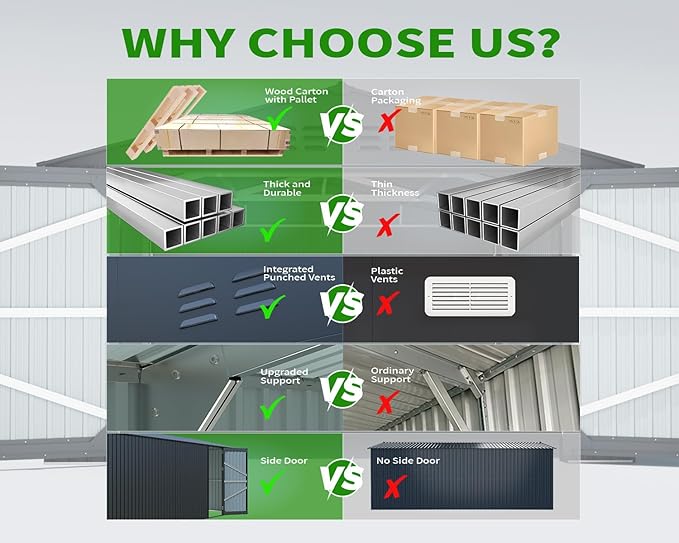 - 🏡 Strong & Durable Construction: Built with galvanized steel reinforcement, this 20x10 storage shed is rustproof, UV-resistant, and moisture-proof. Reinforced thick metal beams and braces provide robust roof support, ensuring garage shed can withstand harsh weather and serve you for years to come.