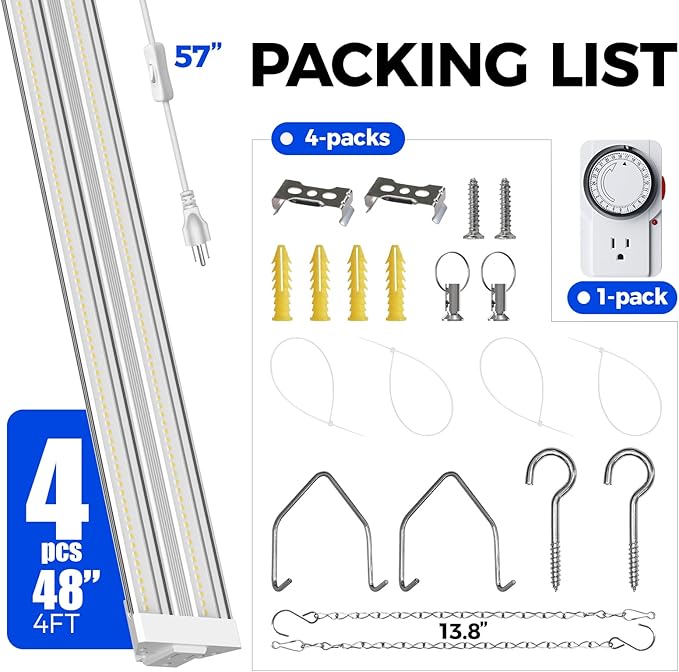 Barrina TX72 4FT Grow Lights for Seed Starting, 288W (4 x 72W, 2000W Equivalent), High PPFD, 5000K Daylight Full Spectrum, Mechanical Timer, Hanging Grow Lights with On/Off Switch Linkable, 4 Packs