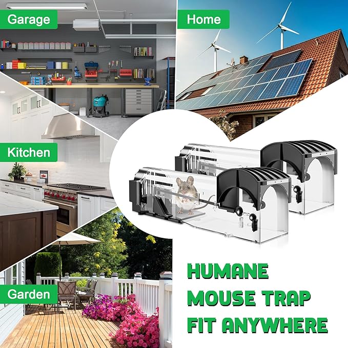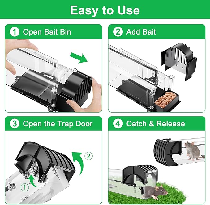 - Easy to Set & Release: Our humane mouse traps are incredibly easy to set up. Simply open and secure the compartment door, then place the bait in the food area. All you have to do is wait for a mouse to arrive. The robust door closure guarantees a secure grip, and when it's time to release them, just open the door outward to let them go into the wild without any direct contact.