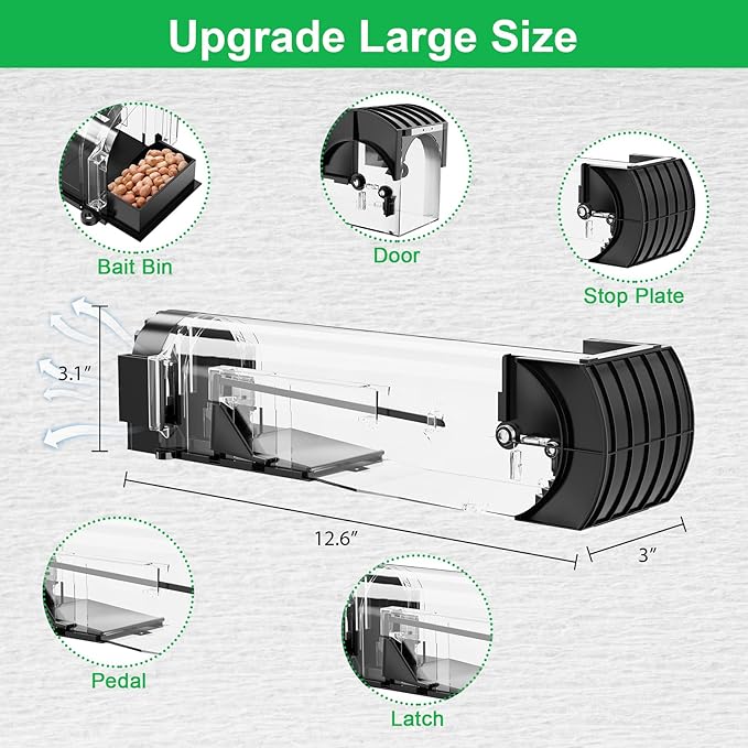 - Enhanced 12.6-inch Size: Unlike other small humane mouse cages, our upgraded live animal traps for rats measure 12.6" in size. Our live traps for mice are designed with additional interior space to fit rats of all sizes, ensuring their tails stay secure during capture. The human mouse trap size offers a humane solution for rodent control!