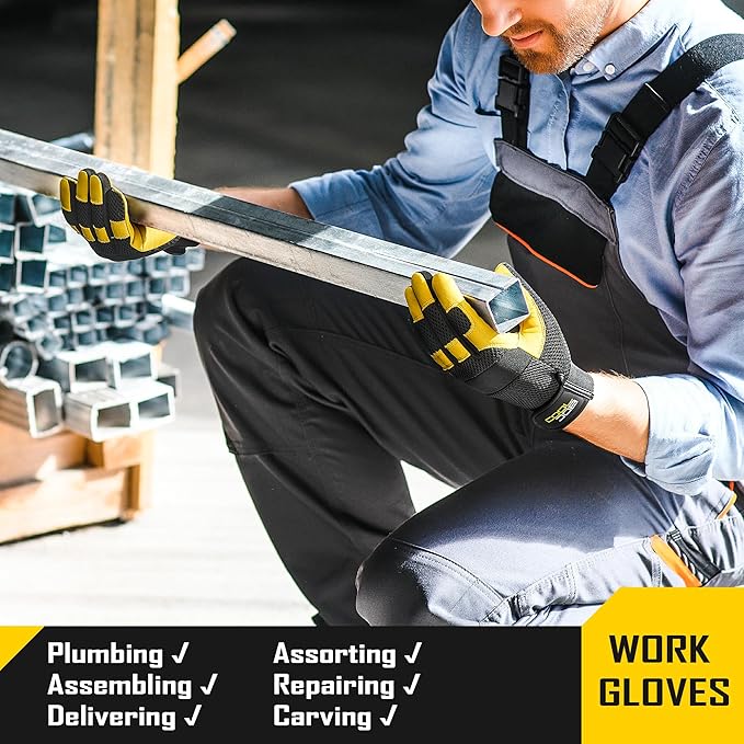 - Unisex Fit & All-Day Comfort: The black-and-yellow contrast design (yellow cowhide palms, black polyester mesh) ensures a neutral, stylish look suitable for both men and women. Ergonomic shaping and a lightweight build reduce hand fatigue during repetitive motions