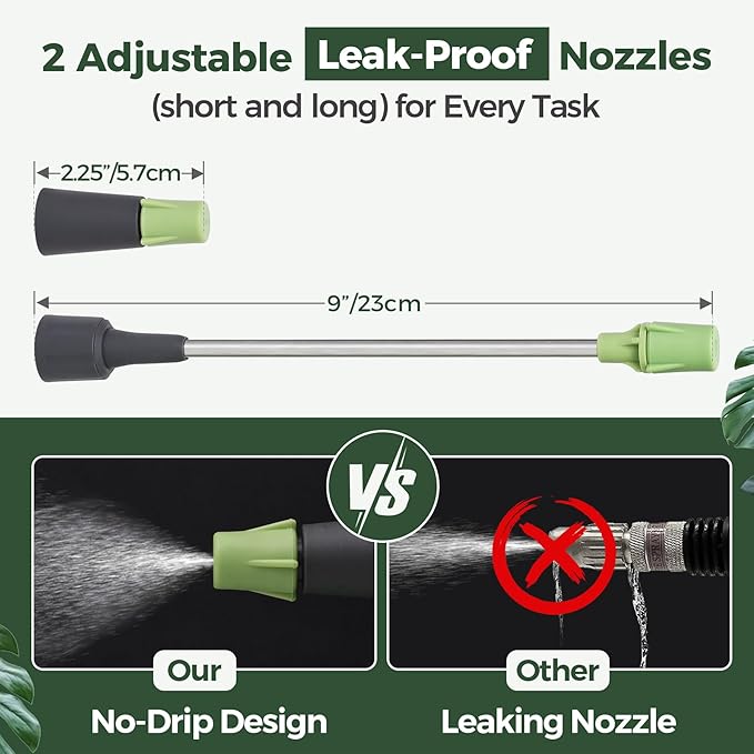 - 【2 Adjustable Nozzles for Every Task】T4U pressure pump spray bottle for plants includes short and long nozzles that switch between mist and strong stream modes, making this garden pump sprayer a versatile choice for all your gardening tasks