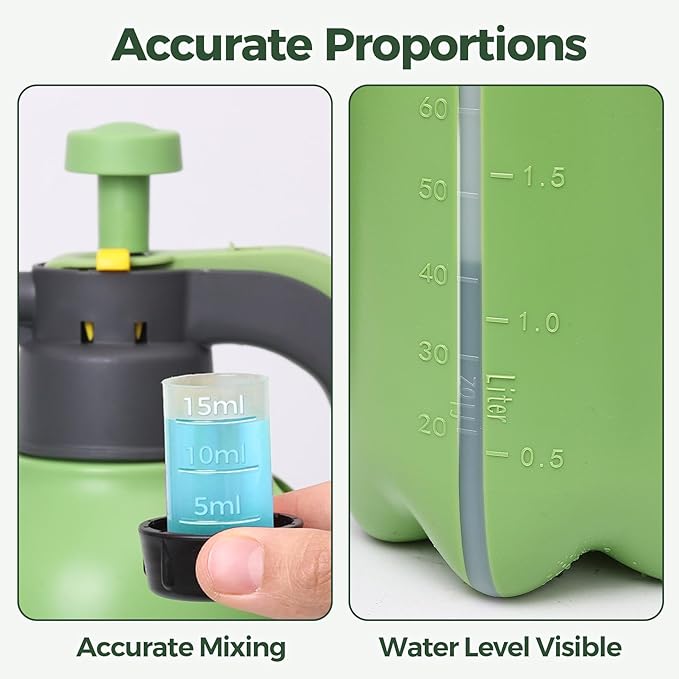 - 【Easy Refills & Precise Mixing】Refill the T4U hand pump sprayer through the side port—no need to take off the top. T4U garden pump sprayer water level indicator and measuring cup keep mixing simple and precise, Precise pump spray bottle for plants