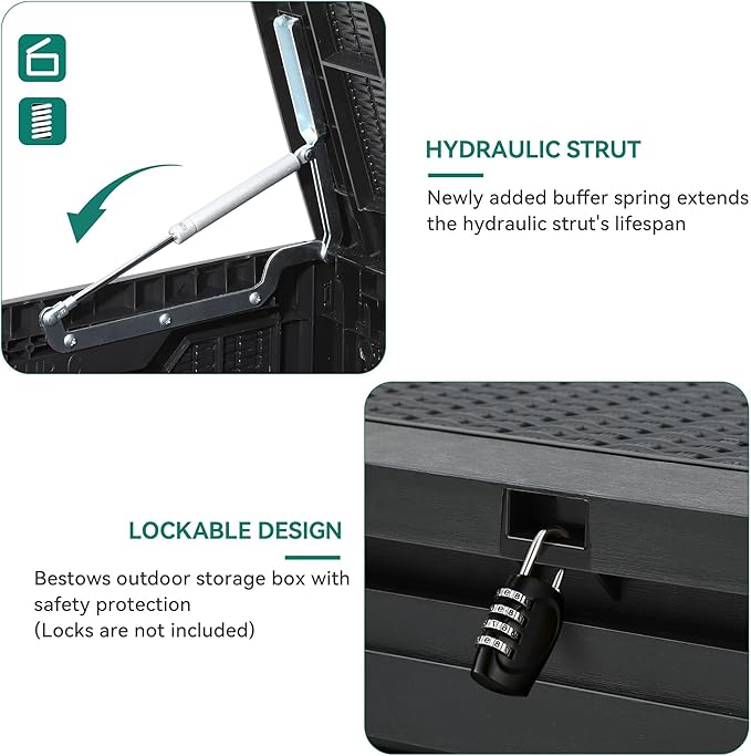 - Built to Last: Crafted from weather-resistant resin, these outdoor deck boxes are waterproof, rust-proof, UV-resistant, and fade-proof, making them ideal for long-term outdoor use in various climate conditions