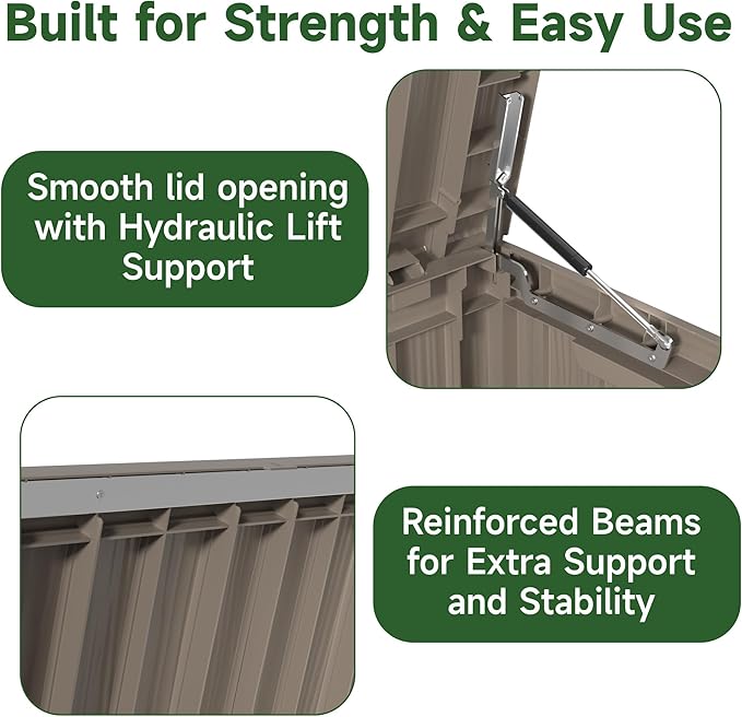- ENHANCED SAFETY FEATURES - The EasyUp storage box features a hydraulic rod that allows for smooth lid opening and closing, reducing the risk of accidental pinching. The built-in locking mechanism adds an extra layer of security, making it ideal for safeguarding outdoor valuables.