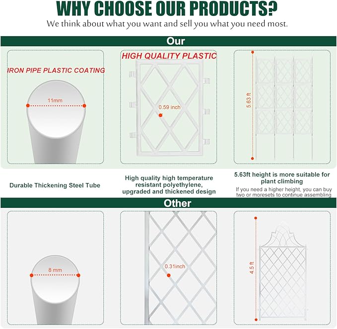 - THICKENED METAL TRELLIS: Thickened plastic "mesh decorative sheet" and plastic coated iron pipe is the highlight of our design, unlike other products, we know that the climbing frame as a fence must be a strong material.The iron pipe is wrapped with high-quality vinyl coating, which can reduces the temperature of the iron pipe surface to prevent scalding of plants, solve all the problems of garden trellis you encounter, and make you use it more Comfortable.