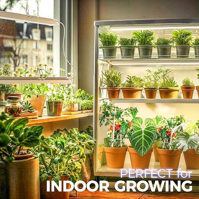 - Flexible & Easy Installation Options: Our full spectrum LED grow lights offer multiple installation methods for hanging or surface mounting. The package includes chains, hooks, anchors, cable ties, clips, and double-sided adhesive tape for quick and easy setup. Customize your lighting to effortlessly grow your indoor seedlings