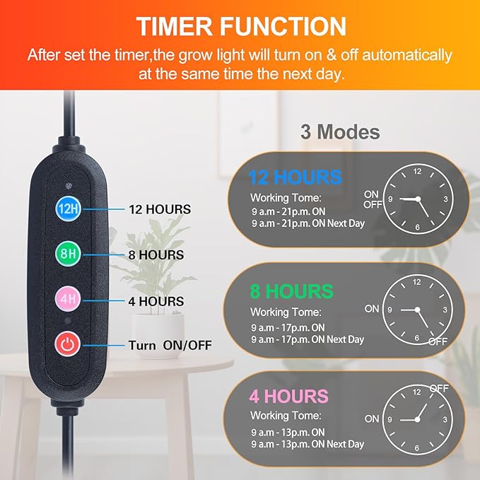- Plug and Play & Timer for Auto On/Off---This Flat Grow Light Designed with inner 4/8/12H Timer. Plug and Play. You can use this Plant Grow Light with Your Home Smart Timer or use the inner 4/8/12H Timer.