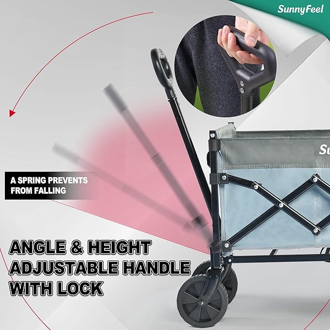 - 【Adjustable Handle】This wagon features a flexible handle that can be adjusted for both height and angle, providing effortless maneuverability and added comfort. The handle can stay in place, keeping it upright so you don't have to bend down to reach it.When not in use, the handle can be suspended for space-saving and convenience. Additionally, the large side pockets provide extra carrying capacity for your belongings