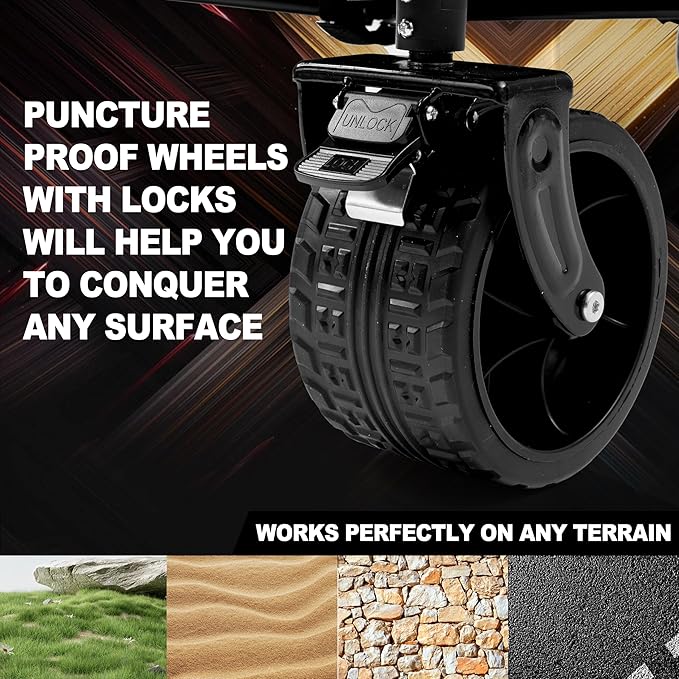 - 【360° Rotating Front Wheels& Locking Brake Design】The high-quality PVC wheels are abrasion-resistant, shock-absorbing, wear-proof, anti-slip, and silent, leaving no drag marks and enhancing the overall durability. The wagon features 360° rotating front wheels with brakes and 4-inch wide all-terrain PVC wheels, providing excellent impact resistance, smooth movement, and superior traction